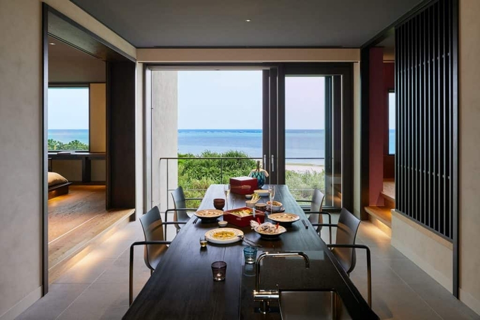 客室に届いたシェフによる下準備済みの料理を、客室の土間ダイニングに備わる調理家電を使って手軽に仕上げられます。時間にとらわれずに、出来立ての本格的な料理を味わうことができるサービスです。30種類以上のバリエーションから料理を選び、海を望むプライベート空間で暮らすように食事を楽しめます。