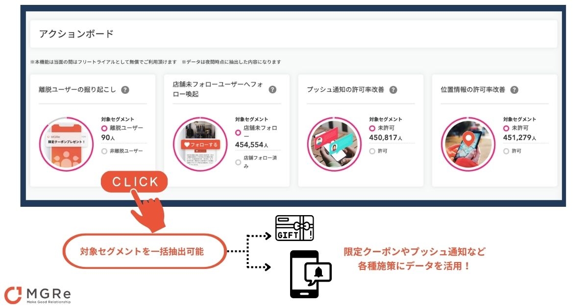 アクションボードは、「離脱ユーザーの掘り起こし」や「プッシュ通知許可率の改善」などアプリ運用において必要な施策を定番施策としてテンプレート化し、簡単にデータの確認、アクション実行を可能にする機能です。例えば、「離脱ユーザー」のデータを一括抽出し、そのユーザーのみに限定クーポンを配布するといった施策を簡単に実行できます。
