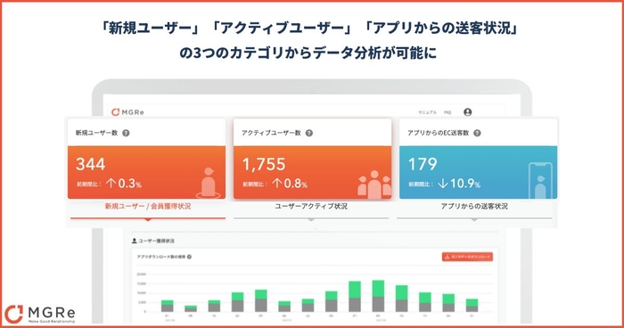 「新規ユーザー」「アクティブユーザー」「アプリからの送客状況」の3つのカテゴリからデータ分析が可能に