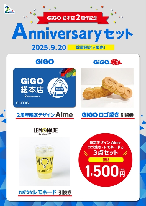 総本店の2周年を記念し、オリジナルデザインのアミューズメントICカード「Aime」と「GiGOロゴ焼き」および「レモネード」の3点をセットにして販売いたします。