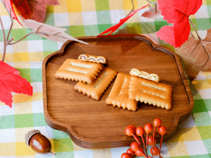 「しるこサンド栗」は、国産和栗ペーストを使用し、栗の豊かな風味が広がる仕上がりです。
