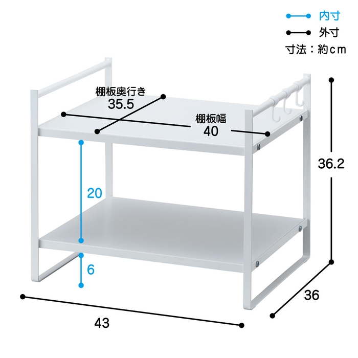 本製品の設置面から下段の棚板までの高さは6mとなっていますので、トレーやお盆、レシピ本やまな板など薄手のものを収納してください。