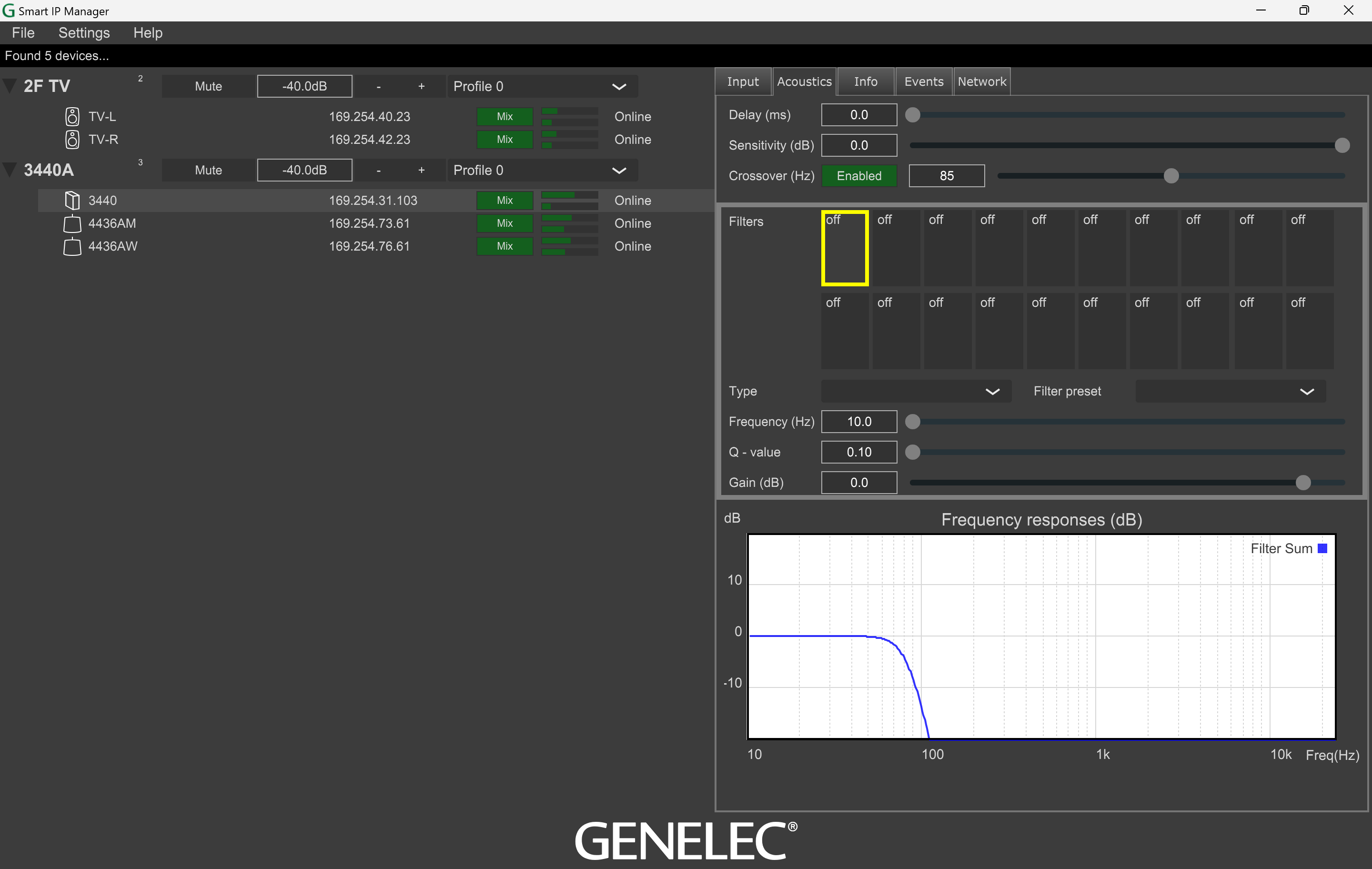 Smart IPシリーズでは、インストーラー向けの無償ソフトウェア「Smart IP マネージャー」を利用することができます。Smart IP マネージャーは、ネットワーク上のデバイスを自動で検知し、3440を含むすべてのSmart IP スピーカー、設置された部屋、ゾーン、オーディオ・チャンネルの詳細な設定および監視、音響調整を可能とする他、ベース・マネージメントなどスピーカーをより理想的に駆動させるための設定を行うことができます。