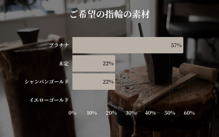 素材では「プラチナ」が57%と最も多く選ばれており、上品で長く使える王道素材として引き続き高い人気を集めています。一方で「未定」が22%を占めており、素材選びに慎重な傾向も見受けられます。また、「シャンパンゴールド」(22%)も一定の支持を得ており、さりげない個性や温かみを求める方に選ばれていることがうかがえます。