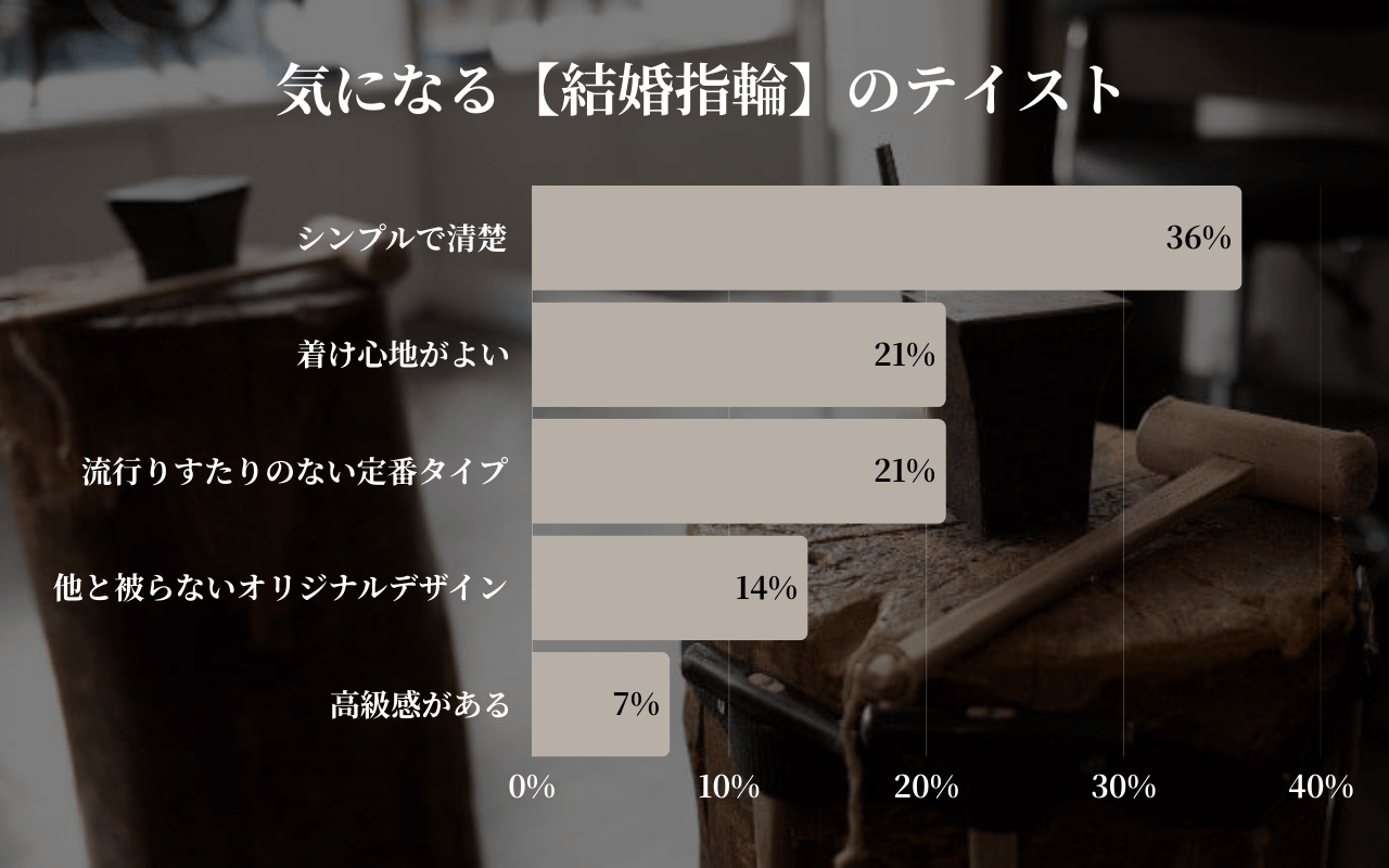 「シンプルで清楚」(36%)というデザインが最も多く選ばれており、婚約指輪と同様に、余計な装飾を控えた洗練されたスタイルへの高い支持がうかがえます。また、「着け心地の良さ」や「時代に左右されにくいベーシックなデザイン」(各21%)も重視されており、長く身につけるアイテムとして、快適さや飽きのこないデザインが求められていることが分かります。