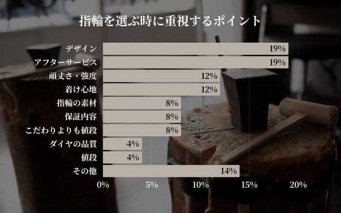 今回の調査では「デザイン」と「アフターサービス」がそれぞれ19%で最も重視され、見た目の魅力と購入後の安心感が選択に大きく影響していることが分かりました。一方、「頑丈さ・強度」や「着け心地」はそれぞれ12%にとどまり、機能面の優先度がやや下がっています。また、「指輪の素材」や「保証内容」、「値段」なども同程度の評価で、多様なニーズが存在することがうかがえます。