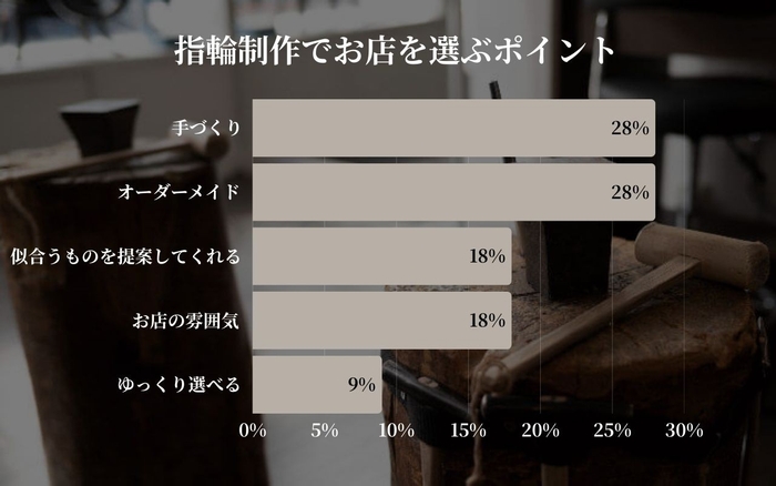「手づくりできる」(40%)という点が来店の主な決め手となっており、体験を通じて思い出を形にできるサービスが引き続き高い関心を集めています。また、「おしゃれなイメージ」(30%)や「オーダーができる」(20%)といった要素も重視されており、世界にひとつだけの特別なリングを求めるニーズの高まりが感じられます。
