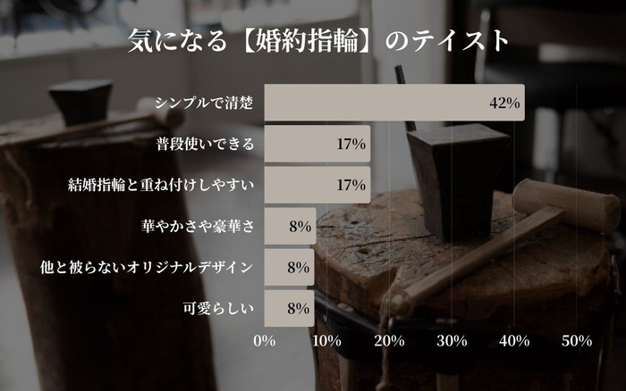 「シンプルで清楚」が42%と圧倒的に支持され、上品で飽きのこないデザインが選ばれる傾向が強まりました。「普段使いできる」「結婚指輪と重ね付けしやすい」も各17%で続き、実用性とのバランスも重視されています。一方で「華やかさ」や「可愛らしさ」は8%にとどまり、デザインはシンプルで普段使いしやすいものが選ばれる傾向にあるようです。