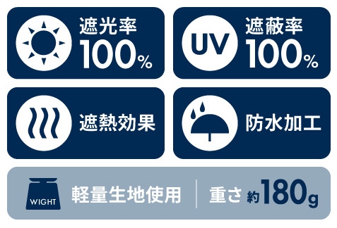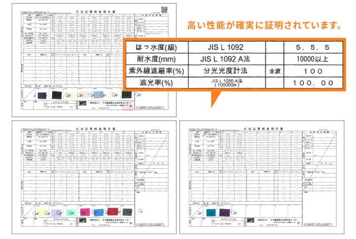 日本繊維製品品質技術センターに試験を依頼(2019年10月16日)し、本商品全ての色の生地において、「遮光率・紫外線遮蔽率100%」、「はっ水5級」の証明をいただきました。