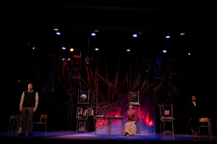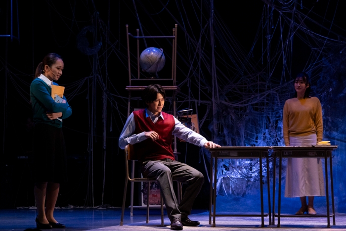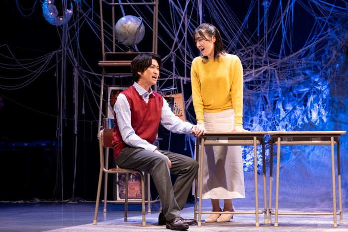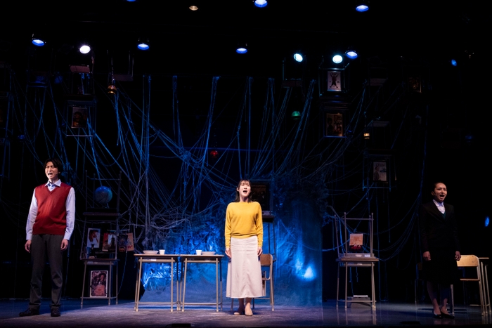 学校机とイスが積み上げ、ぶら下げられ、糸が張り巡らされたようなステージは幻想的で、作品のイメージを見事に表現。冒頭から、チェロとピアノだけの生演奏にキャストたちの歌声が美しく響き合い、その熱量に圧倒される。「白猫」も「黒猫」も実力派がそろっているだけに、その歌声がダイレクトに胸に迫ってくる。