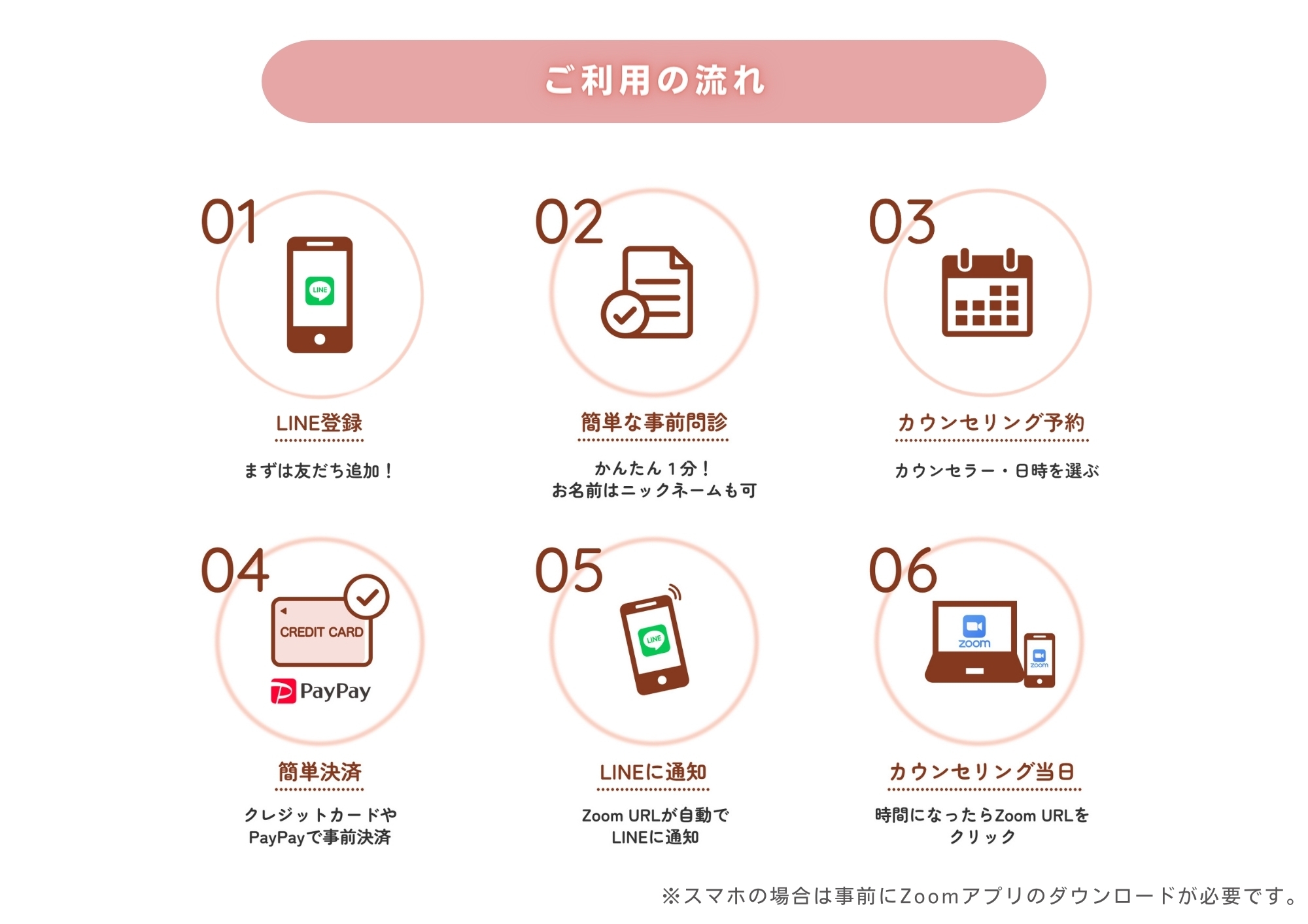 面倒な会員登録や専用アプリは不要です。使い慣れたLINEから24時間365日いつでも予約を取ることができます。カウンセリングもZoomを利用して行うため、スマホ一つで完結することができます。
