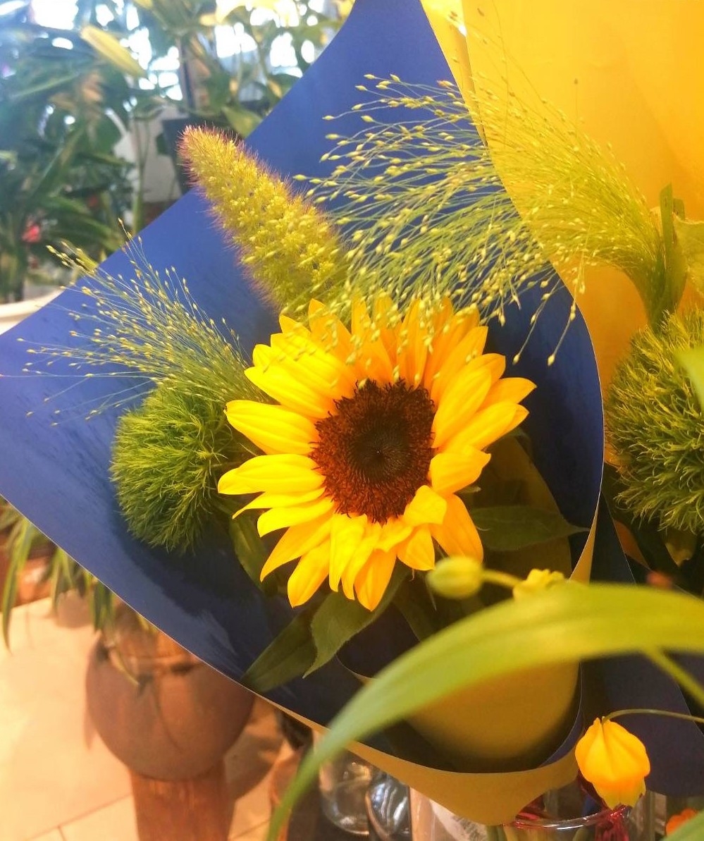 ひまわりとグリーンを合わせたシンプルなフレッシュブーケ。父の日の贈り物に+α、黄色のお花を添えて。