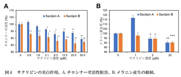 紫外線照射ストレスを受けると、メラニン色素の合成が促進されてシミの原因となります。メラニンはメラノサイトと呼ばれる細胞中で、チロシナーゼ(注10)という酵素のはたらきによって生産されます。本研究により、サクリピンがチロシナーゼの活性を阻害し、マウスのメラノサイト由来培養細胞におけるメラニンの産生を抑制することを突き止めました(図4)。チロシナーゼ活性については、サクリピンAよりもサクリピンBが強い阻害作用を示しました。これらの結果は、サクリピンがシミの形成を抑制する美白剤としての機能を有することを示唆しています。