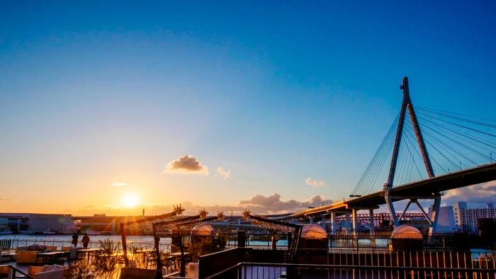 元旦の初日の出が昇る時間帯は、テラスにて日本酒などのドリンクのふるまいを実施。