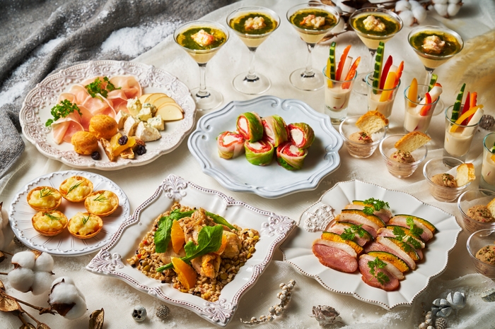 白菜とスモークサーモンのルーロー 春菊ソース,蟹と海苔のフラン,鱈のブランダード メルバトースト添え,レンズ豆とチキンのサラダ オレンジ風味,シーフードとサフランクリームのミニタルト,スモーク鴨とかぼちゃのロースト,蟹味噌バーニャカウダ,ミックスサラダ,チーズ&ドライフルーツ,生ハム&グジェールとポレンタ