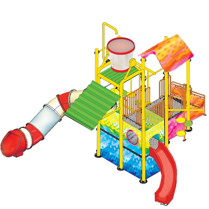 お子さまに大人気のエリア。スライダーが2つに増え、水が降り注ぐ巨大バケツも!