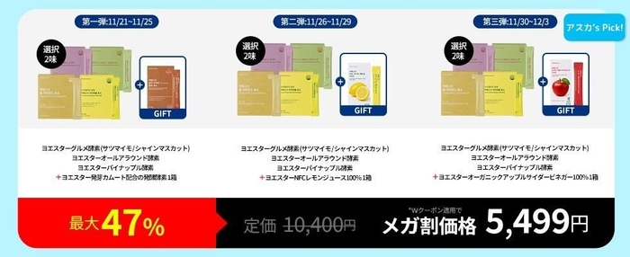 アスカさんのオススメ商品を厳選した「アスカセット」では、日々の健康とリズムを整える酵素サプリを主軸とした健康とダイエットに特化した構成となっております。第一弾ではヨエスター酵素選べる2種類に加えて、カムート酵素をプレゼント!酵素で食べ過ぎや夜遅い食事の後に感じる重さや不快感をやさしく和らげ、体のリズムを整えるサポートをします。酵素をお得にゲットして健康的な生活習慣を作りましょう!