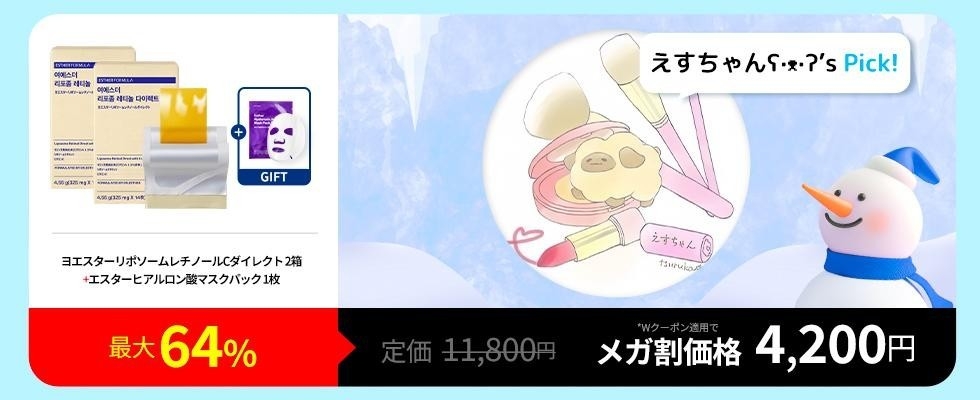 えすちゃんʕ·ᴥ·ʔがおすすめするレチノールフィルムセットがメガ割特価で登場!1箱購入でもう1箱ついてきて64%OFF。リポソームレチノールは毛穴ケア、くすみ改善、トーンアップなどに効果的で、紫外線が気になる方にもおすすめです。レチノールの力で肌の調子を整え、白肌ケアからニキビケアまでしっかりサポート!輝く美肌は体内からしっかりケアを!