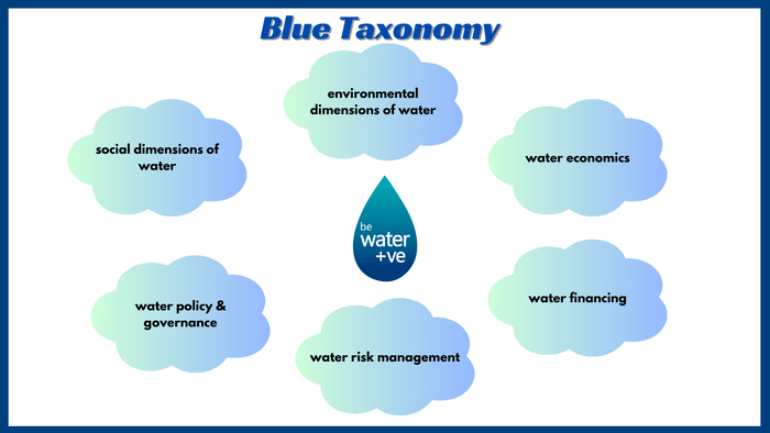 世界初の「Blue Taxonomy(青色分類法)」は、水の利用と効率性、水資源の経済的・社会的側面、水管理、水金融、水市場に関する様々な側面を分類・分類するものである。この分類法は、水の複雑な経済的、環境的、社会的側面を整理し、理解するための枠組みを提供する。