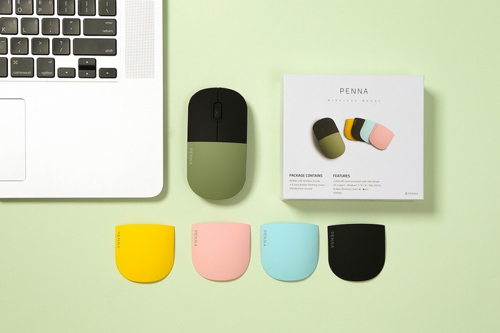 PENNA Retro Mouseの最大の特徴は、気分に合わせてカバーを簡単に着せ替えできること。基本セットには、ピンク、ミント、イエロー、ブラックの4色が付属しており、その日の気分やデスクのインテリアに合わせて自由にカスタマイズが可能です。マウスは、ただの道具ではなく、個性を表現するためのアイテムに進化しました。