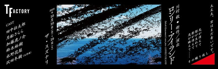 ティーファクトリー主催、『ロンリー・アイランド』が2025年10月10日 (金) 〜 2025年10月19日 (日)にザ・スズナリ(東京都 世田谷区 北沢 1-45-15)にて上演されます。 チケットはカンフェティ(運営:ロングランプランニング株式会社、東京都新宿区、代表取締役:榑松 大剛)にて発売中です。