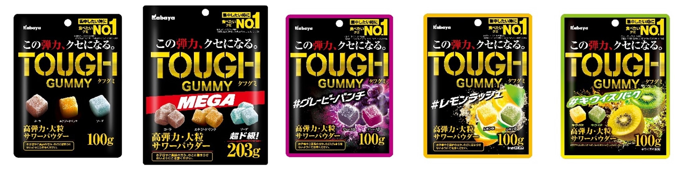 『タフグミ』は「集中したい時に食べたいグミブランド No.1」※「ハードグミ人気 No.1」※を獲得した、高弾力食感とどこから噛んでも同じ噛み応えとなるキューブ型が特長の大粒グミで、合計5品を展開しています。全国のスーパーマーケットやコンビニエンスストアで販売中。