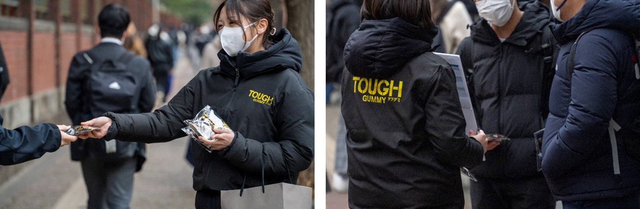 2025年1月18日(土)と19日(日)に共通テストが行われた東京大学本郷キャンパスと横浜国立大学常盤台キャンパスの試験会場周辺にて、試験後の受験生たちに向けて、『タフグミ』と集中御守ステッカーのサンプリングを実施しました。一時的に緊張がほどけた表情や、気持ちを引き締め直す表情など、様々な面持ちで会場を後にし、これから帰宅して自己採点をしたり、二次試験の対策をしたり、まだまだ集中力を切らすことができない“タフ組”の皆さん一人ひとりに、応援の気持ちを込めて手渡しました。ご自分のことだけでも手一杯であろう中、今回のサンプリング品のお渡しに対し、「ありがとうございます」という温かい言葉と笑顔を返してくださった受験生が多かったことが特に印象的でした。皆様の努力が実を結び、明るい春が訪れんことを心から願っています。