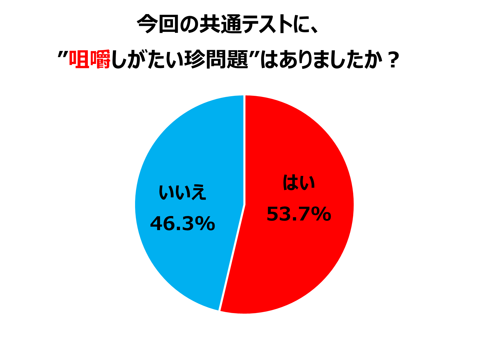 最後に、例年、SNS上で話題になるツッコミどころ満載の問題について、今回の共通テストでは「“咀嚼しがたい”珍問題」の有無を尋ねると、過半数である53.7%が「はい」と答えました。今年の共通テストでも、“咀嚼しがたい”問題の登場に、頭を抱えた受験生も多かったのかもしれません。具体的な声としては、「国語のヒス構文」や「英語の戦隊モノ」、「数学の噴水」、「化学の枕草子」などが挙げられていました。