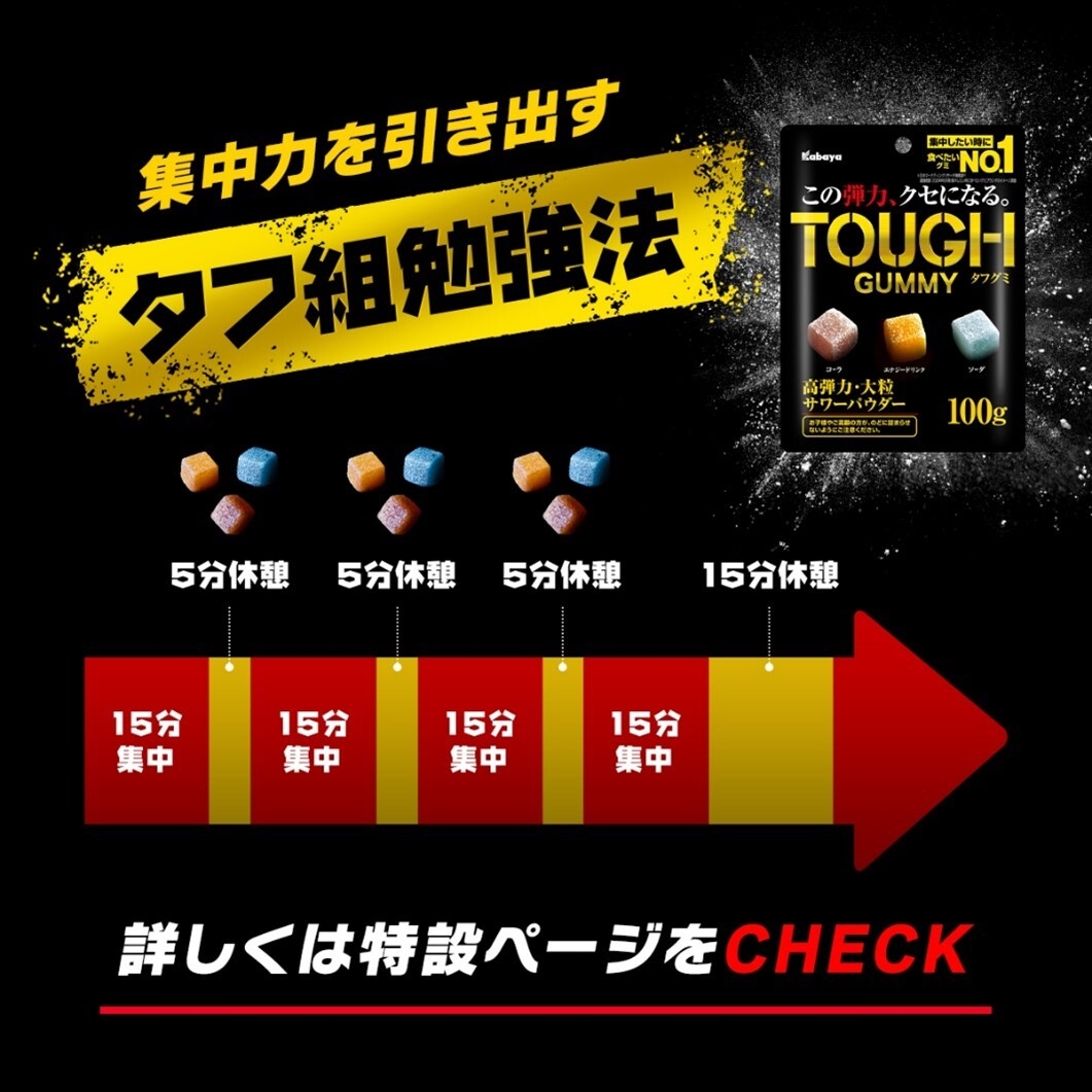 今回のアンケート調査では実に84.4%の受験生が集中力が維持できなくて悩んだ経験をお持ちであると判明しましたが、「タフ組勉強法」とは、そんな“タフ組”の皆さんを応援するためにカバヤ食品が生理学研究所の柿木 隆介名誉教授の監修を受けて考案した勉強法です。短時間の集中と休憩を繰り返す勉強法と、脳機能向上に寄与する可能性がある「咀嚼」を掛け合わせたもので、勉強の合間に噛み応えがある高弾力食感の『タフグミ』を食べていただくことにより、集中力や効率アップのサポートを目指します。