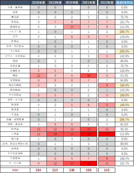 不動産売却を行った企業を業種別に分類し2018年以降の推移を追うと、2022年度の特徴としてこれまでCREの動きが乏しかった「輸送用機器」(過去4年対比320%増)、「陸運業」(過去4年対比189.5%増)の売却件数が大きく増加した点に注目したい。