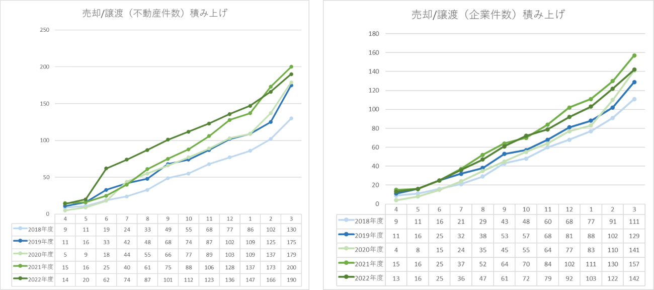 2018年度以降の上場企業が公表した不動産売却に関するプレスリリースについて独自に集計を行った結果、2022年度は売却不動産件数190件、売却企業件数142社とコロナ禍前の2018・2019年度と比較すると年々、企業不動産の持たざる経営へのシフトが進行・定着化していることが見て取れる(下図参照)。