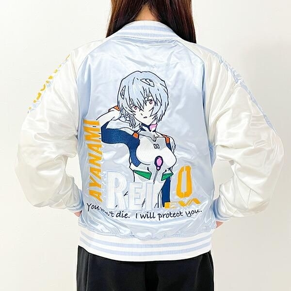 まずはこちら、「綾波レイ」モデルのスカジャン。背面に大きく刺繍されたかっこいい姿が特徴で、綾波レイ推しの方必見です!