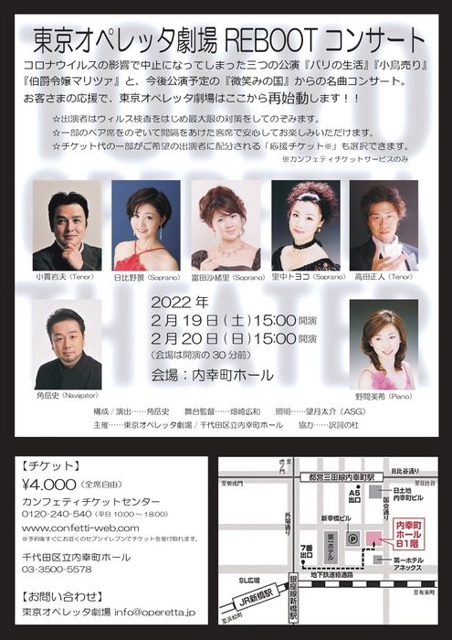 東京オペレッタ劇場(代表:角 岳史)主催による『東京オペレッタ劇場REBOOT』が2022年2月19日(土)~2月20日(日)に内幸町ホール(東京都千代田区)にて上演されます。チケットはカンフェティ(運営:ロングランプランニング株式会社、東京都新宿区、代表取締役:榑松 大剛)にて12月20日(月)よりチケット発売開始です。