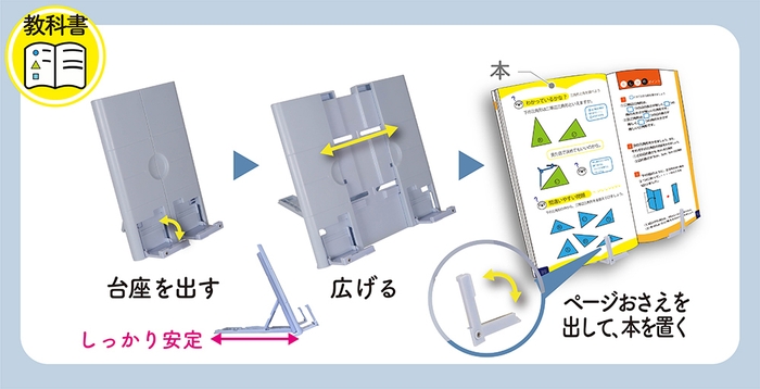 書見台を広げ台座を出し、スタンド立てると教科書を置くことが出来ます。