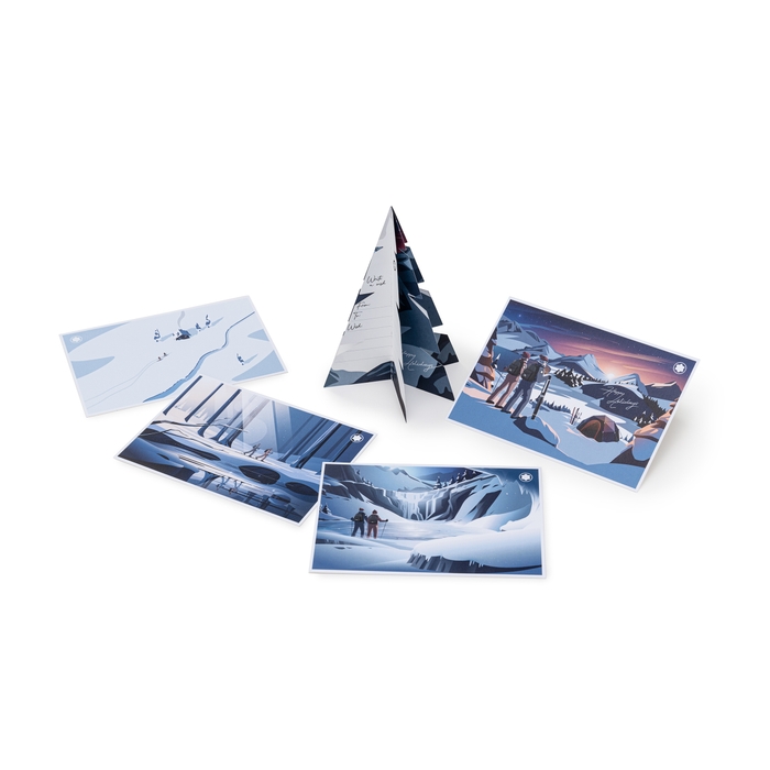 期間中、税込み30,000円以上のお買い上げで、冬のご挨拶やギフトに添えるカードとしてもお使いいただけるモンブラン オリジナル カードセットを差し上げます。モンブラン山でスキーを楽しむ人々や風景を描いたポストカード4枚とホリデーのウィッシュリストとしてもお使いいただけるツリーカード1枚が同梱された特別なセットです。