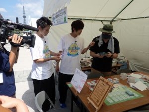 アイドルグループによる取材班の取材を受けるなどの想定外の出来事もありながら、部員側も楽しみながら出展が出来ました。参加した学生からは「製作したカードゲームに熱中してくれてうれしかった」、「植物のしおりづくりもカードゲームも生の反応が得られてよかった」、「イベントに出ることで、様々な人からの意見が聞けてよかった」、「企業等のブースで最新の環境技術などが見られてよかった」などの声がありました。