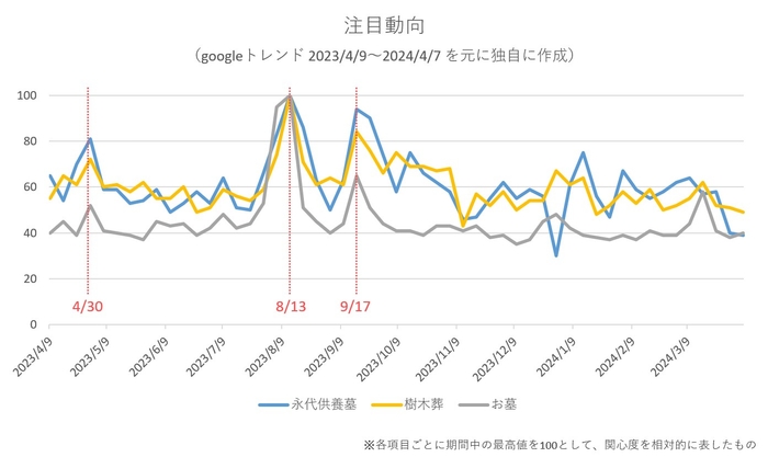 検索数から関心度の推移が分かるGoogleトレンドによると、「永代供養墓」「樹木葬」「お墓」のキーワードでの検索数が最も高まるのはお盆や秋彼岸の時期で、それに次いで高いのがゴールデンウィークであることが分かります。
