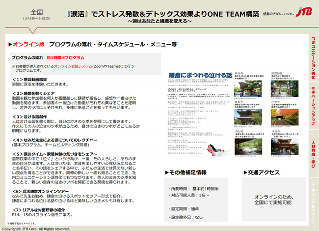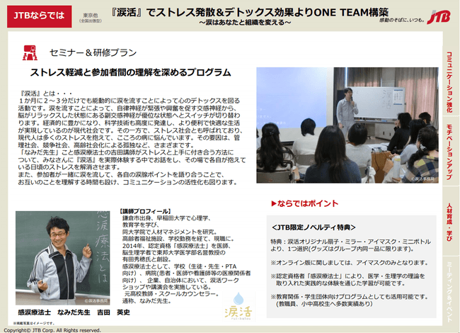 意識的に泣いてストレスを解消する活動『涙活(るいかつ)』を提唱する、なみだ先生こと感涙療法士の吉田英史は、株式会社JTB (本社:東京都品川区東品川2-3-11 JTBビル、代表取締役社長:山北栄二郎)と提携して、「『涙活』でストレス発散&デトックス効果でONE TEAM構築」と題したセミナー&研修プランを開発し、販売しています。 9月からオンライン版もリリースされました。