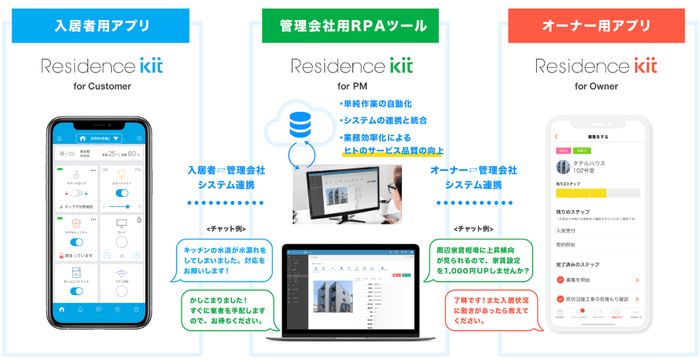 他方で、賃貸不動産オーナー様やデベロッパー様は、入居者ニーズが高いIoT設備が充実した「Residence kit」を導入することで、利便性の高いハイグレードなセキュリティIoT賃貸住宅へ簡単にアップデートすることが可能となります。また、チャット機能や専用のCRMシステムを活用することでまだまだアナログな賃貸管理業務の工数を削減し、コストダウンへ繋げることができます。