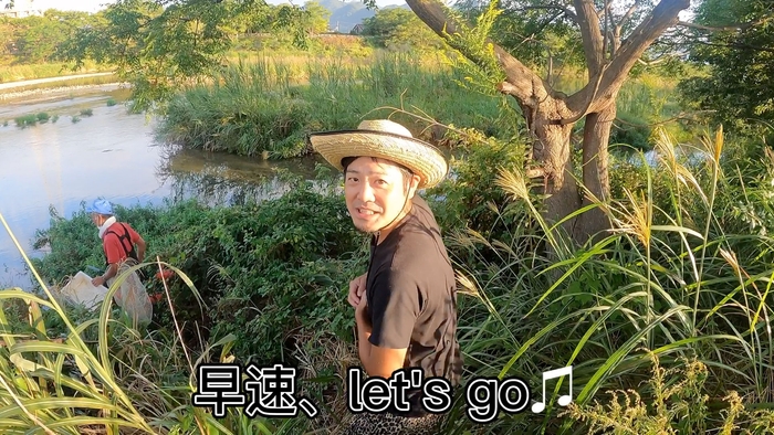 するっと坂を降りてポイントへと足早に歩いていく岡田さん。與座は機敏に動く岡田さんについて行くのに必死です。 川を歩きはじめて数分。ポイントに到着すると慣れた手付きで仕掛けを下ろしていく岡田さん。その後も長い川を数カ所にわたり仕掛けていきます。