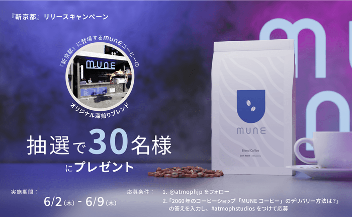 そのリリースを記念して「新京都」に登場する未来の珈琲屋、MUNEコーヒー (ミューンコーヒー) のオリジナル深煎りブレンドのプレゼントキャンペーンも本日から実施します!