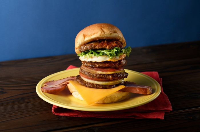 スパイスが効いた4枚のパティと厚切りベーコンやチーズを自家製バンズでサンド。