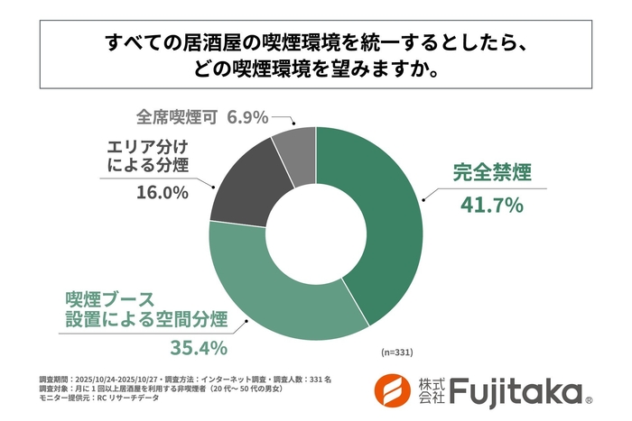 株式会社Fujitaka(本社:京都府京都市、代表取締役:髙井 茂行)は、月に1回以上居酒屋を利用する非喫煙者(20代~50代の男女)を対象に「居酒屋の喫煙環境に関する非喫煙者の意識と実態調査」を実施しました。この調査から、月に1回以上居酒屋を利用する非喫煙者における、居酒屋の喫煙環境が店選びに与える影響や、同行者の喫煙習慣の有無によって選ぶ店の喫煙環境などが明らかになりました。