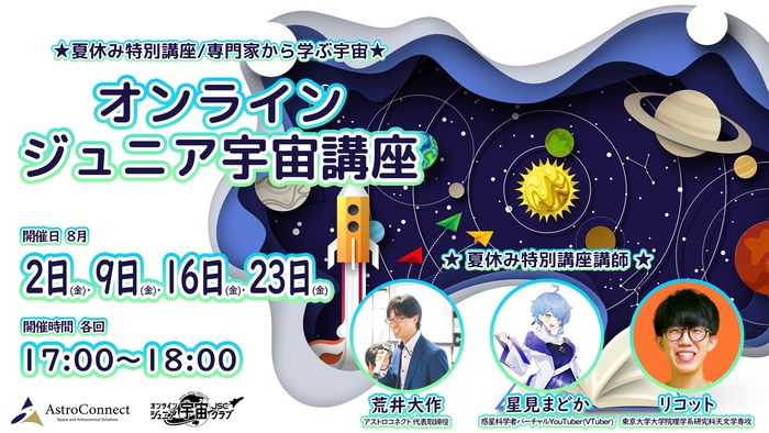 株式会社アストロコネクト(本社:神奈川県川崎市多摩区 代表取締役:荒井大作、以下、アストロコネクト)は、小学生を対象にした専門家から学べるオンライン夏休み特別講座『オンラインジュニア宇宙講座』を、2024年8月2日より全4回開催いたします。