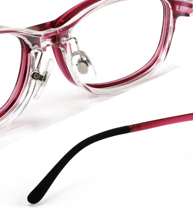 鼻パッドと耳掛け部には、芯入りのラバー素材を使用。お顔やお好みに合わせて調整できるため、長時間掛けていても疲れにくいです。