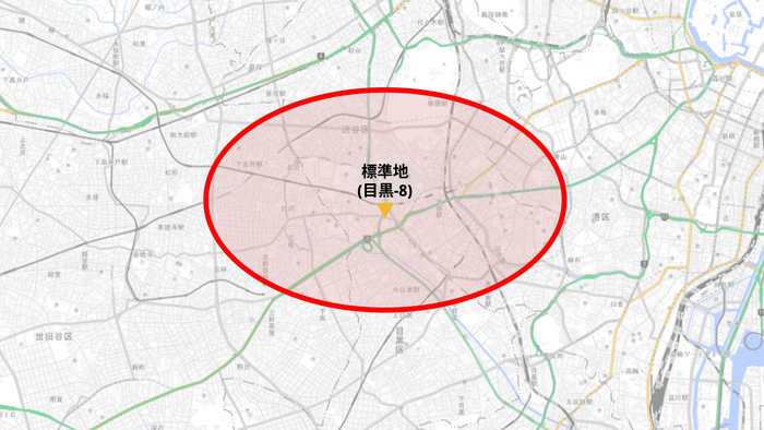 今回は、標準地(目黒-8)周辺の下記エリア内のマンション事例①(築10年~19年)、マンション事例②(築20年~29年)、マンション事例③(築30年~45年)を対象に、過去5年の一般市場価格を抽出します。