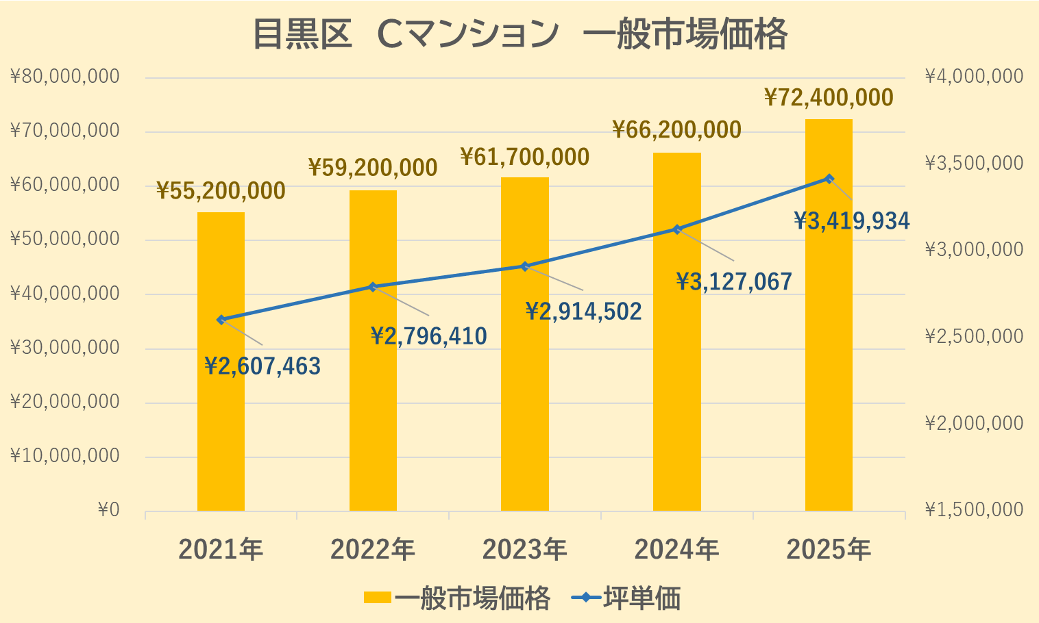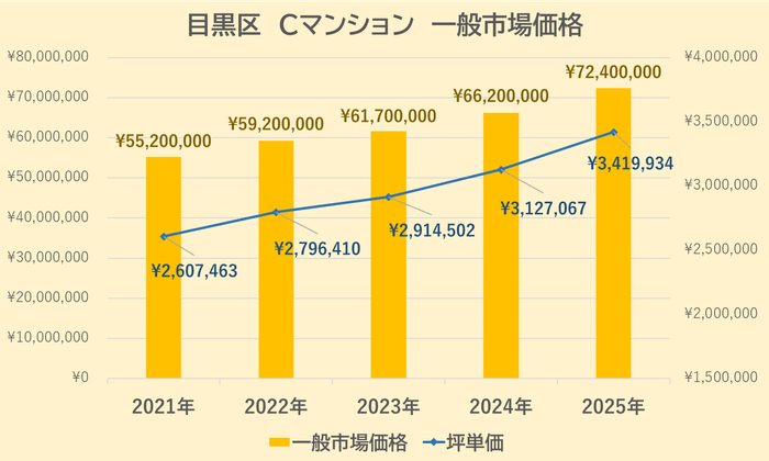Cマンションの一般市場価格・坪単価の推移は上記【図5】の通りです。