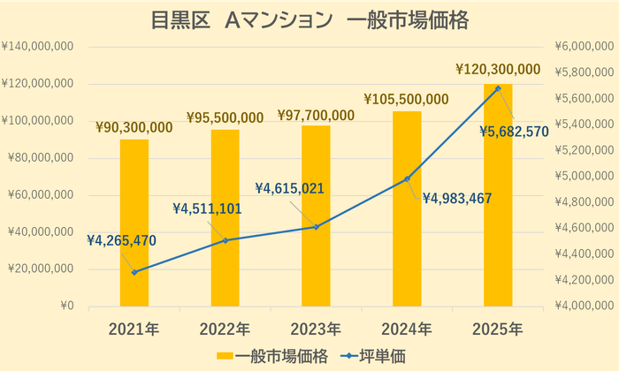 2021年は9,030 万円(坪単価:約426万円 (以下 @426万円) )でしたが、翌2022年は9,550万円(@451万円)、2023年は9,770万円(@461万円)、2024年は10,550万円(@498万円)、2025年は12,030万円(@568万円)と上昇を続けていることがわかります。