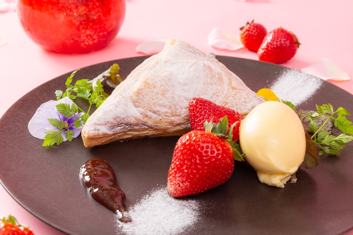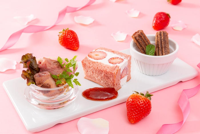 ウェルカムスイーツには、「苺と小豆のアンクルート バニラアイス添え」をご用意。甘酸っぱい苺と甘い小豆をパイ生地で包み焼き上げた一皿です。アフタヌーンティースタンドには、「苺とミントのジュレ」、「苺とチョコレートのテリーヌ」、「チュロス 苺のディップソース」など滋賀県の農園からの産地直送いちごを使用したスイーツ7種に加え、冬の味覚「寒鰆のたたき 紫蘇風味」や、「鴨スモークと牛蒡のマリネ ソースジェノバ」、「豚肩ロース肉の炙り マスタード添え」などのセイボリー5種をご用意。ドリンクは、コーヒー、紅茶、ハーブティー、ソフトドリンク7種類をフリードリンクでご利用いただけます。
