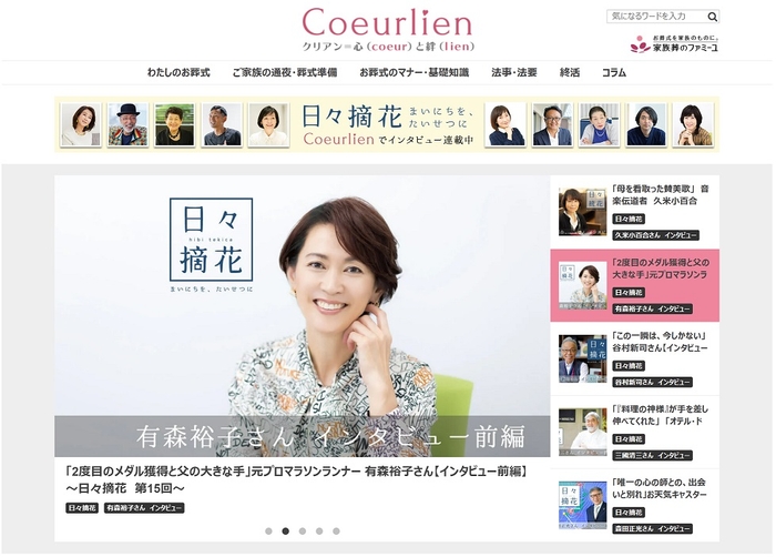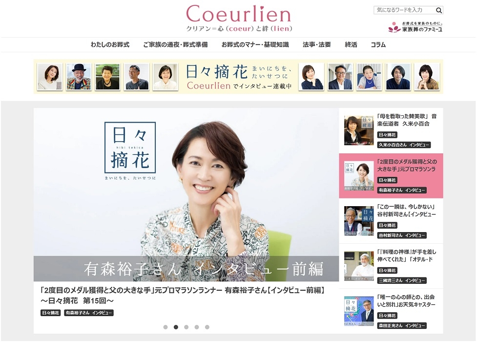 「日々摘花(ひびてきか)」はその『Coeurlien』の看板コーナーです。人は必ず、大切な人との別れを経験します。大きな悲しみに襲われ、喪失感に苛まれながらも、現実を受け容れるしかない。ならばその新しい日々の中で、心の中に生き続ける故人と時々対話しながら、自分自身をアップデートする…。そんな体験をお持ちの著名人が、大切な人との別れや死生観などを共有しています。